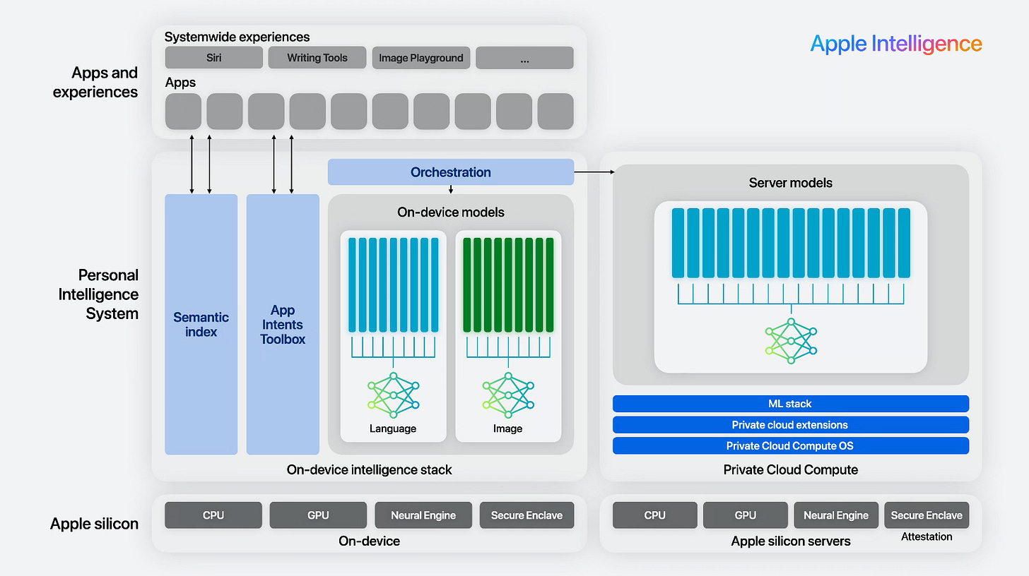 Apple traditionally has had a strict on device first policy for data privacy protection, and while they built an AI infrastructure to try to have AI models run on devices as much as possible through Apple Silicon, Apple Intelligence leverages both on device and cloud computing models. Since Foundation models are pushing what can be done on device because of their size, this was something that was probably unavoidable.